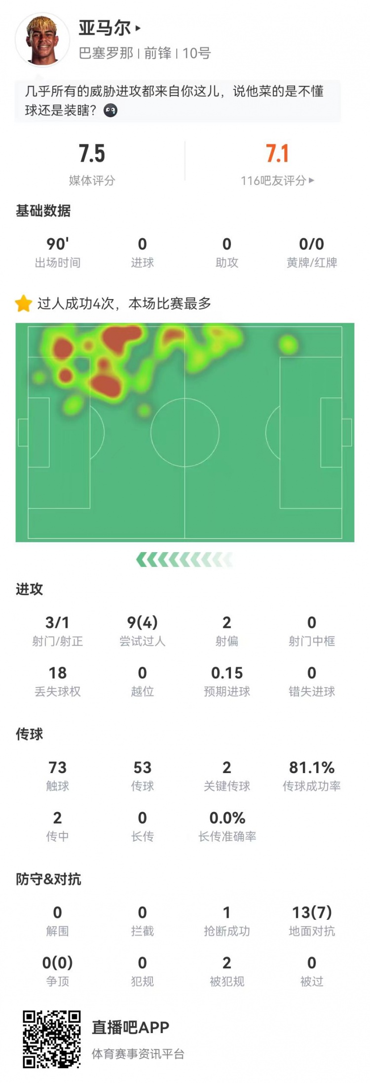 1月4日讯 巴萨在本轮西甲对阵西班经纪东说念主,亚马尔本场数据如下:
