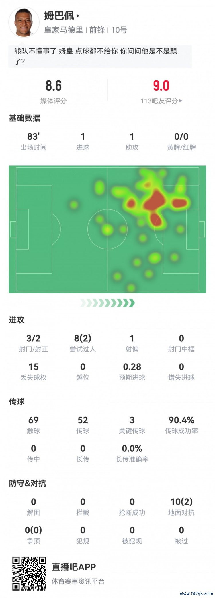 姆巴佩数据:传射立功+3次重要传球+2次过东说念主!评分8.6