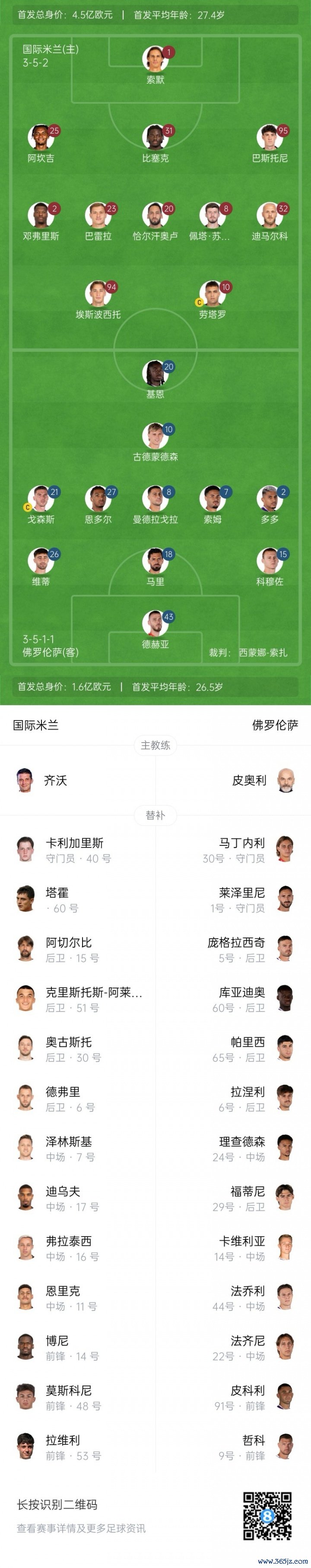 海外米兰首发:1-索默、25-阿坎吉、31-比塞克、95-巴斯托尼、32-迪马尔科、2-邓弗里斯、23-巴雷拉、20-恰尔汗奥卢、8-苏契奇、94-埃斯波西托、10-劳塔罗