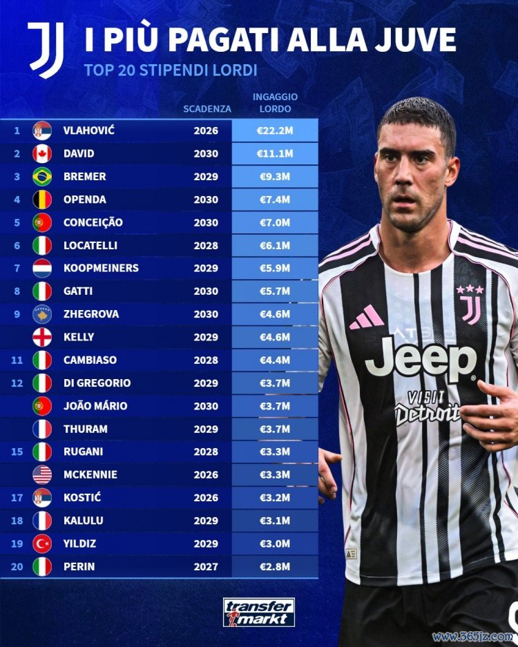 11月20日讯 德国转会阛阓统计了尤文球员的税客岁薪,并排出前二十名榜单,弗拉霍维奇2220万欧居首,戴维1110万欧次席。