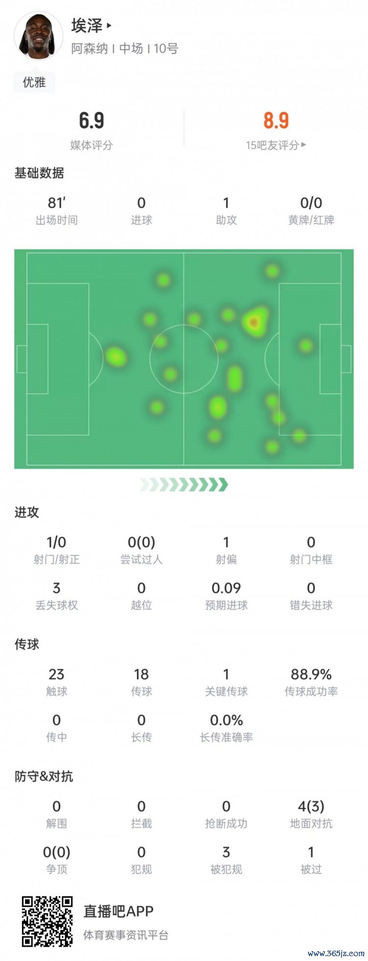 埃泽本场数据:送出助攻,4次起义3次得胜,获评6.9分