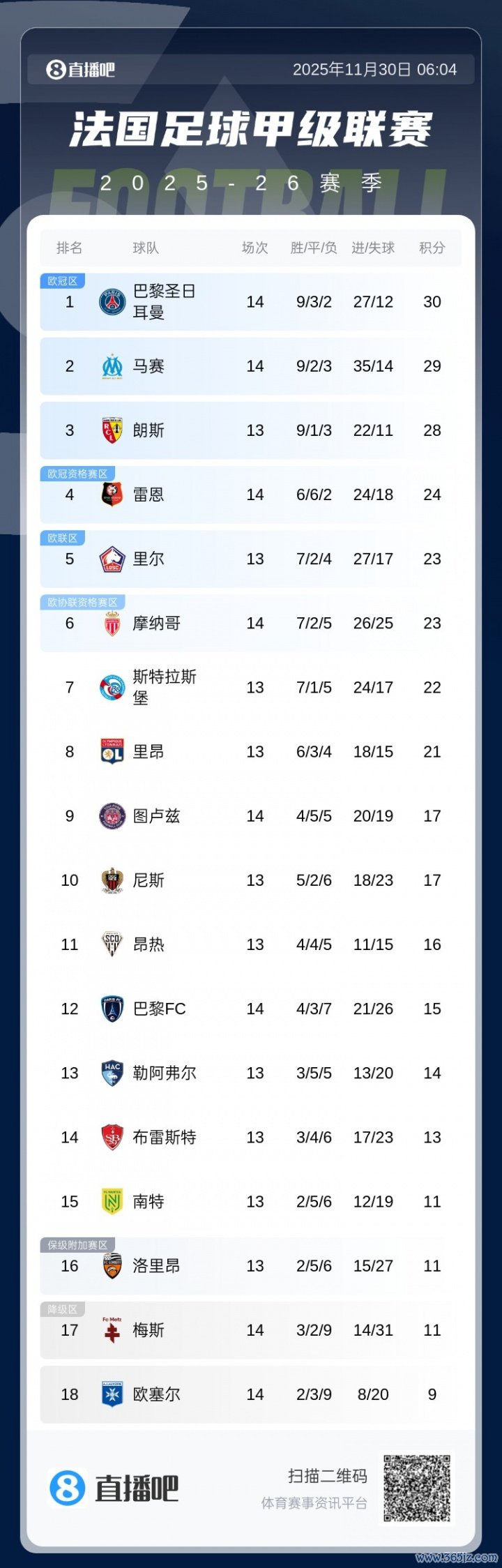 法甲积分榜:前二巴黎、马赛王人刹车!朗斯若明晨赢球可结束登顶