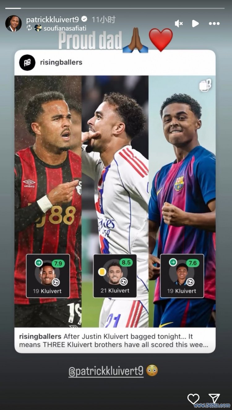 10月4日讯 荷兰足坛名宿帕特里克-克鲁伊维特更新社媒动态,庆祝三个犬子本周获得进球。