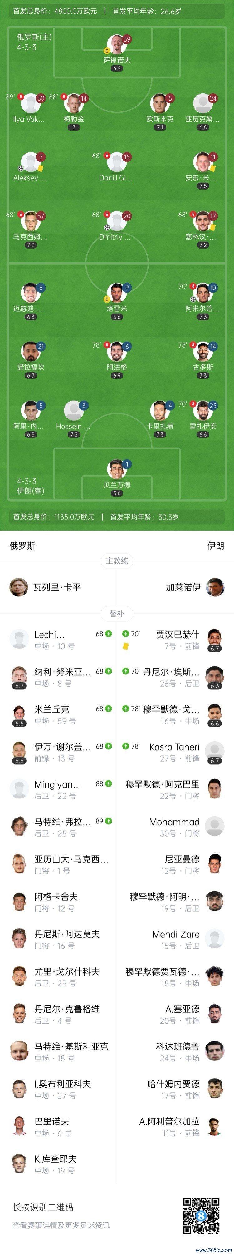 沃罗比约夫、巴特拉科夫为俄罗斯破门,伊朗队由胡赛恩扎德打进1球。