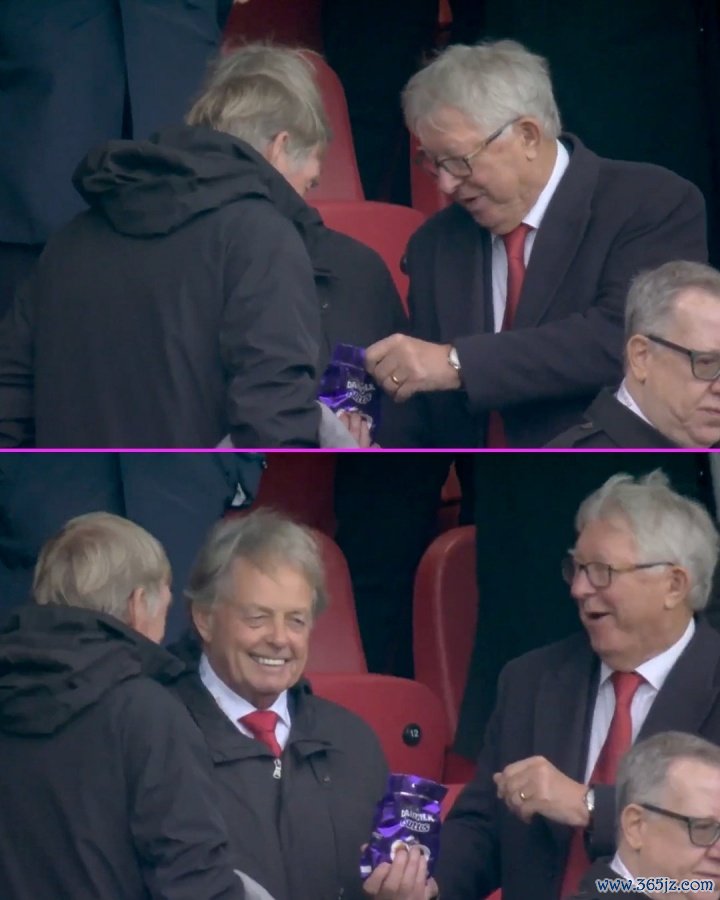 10月20日讯 曼联vs利物浦下半场,镜头给到看台上,弗格森在看台上共享巧克力给达格利什,此时比分曼联1-0跳跃!