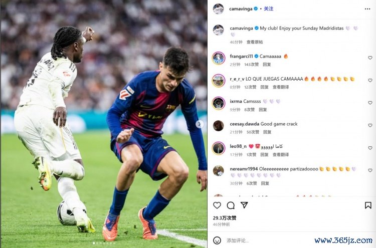 卡马文加在赛后通过社媒晒出我方同佩德里的对位照,并配文:“我的俱乐部!享受周日吧,马德里想法者们!”