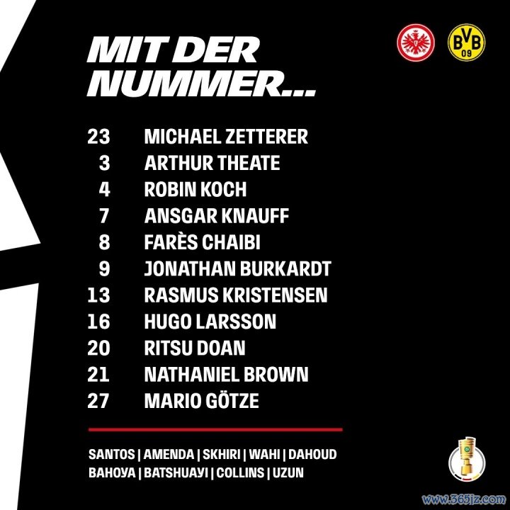 法兰克福替补:40-考昂-桑托斯、5-阿曼达、15-斯希里、17-瓦希、18-达胡德、19-巴霍亚、30-巴舒亚伊、34-纳姆迪-科林斯、42-乌尊