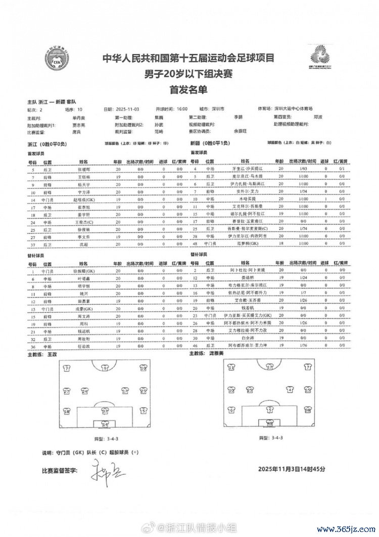 全运会男足U20浙江队vs新疆队首发:王钰栋、张瑷晖、宁方泽出战