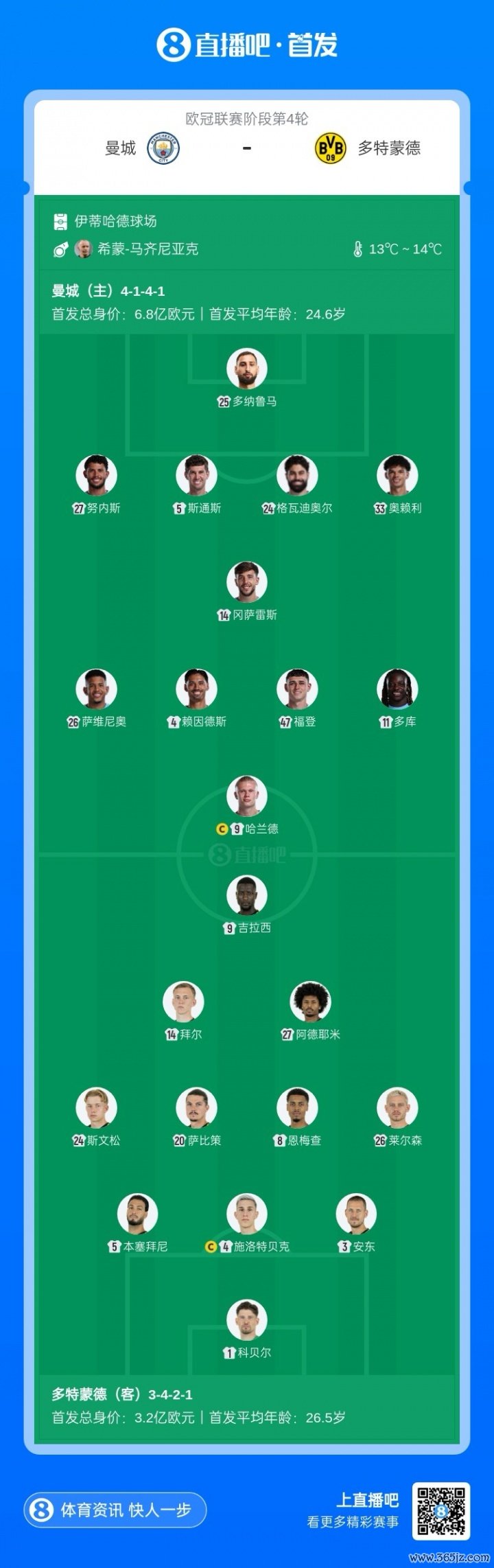 11月6日讯 欧冠联赛阶段第4轮,曼城主场迎战多特蒙德,赛前两边首发公布。【曼城方面,哈兰德战旧主,赖因德斯、萨维尼奥、福登所有先发,B席、胡桑诺夫、谢尔基替补待命;多特方面,吉拉西、阿德耶米领衔先发,小贝林、法比奥·席尔瓦镇守替补席。】