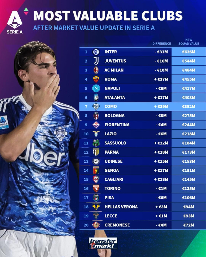 国际米兰、尤文图斯和AC米兰的身价均有下降,但依旧分别以6.36亿、5.44亿和4.84亿位列前三。罗马的身价上涨3700万来到4.55亿来到第四位;科莫的涨幅更是达到3900万,总身价为3.52亿排名第七。