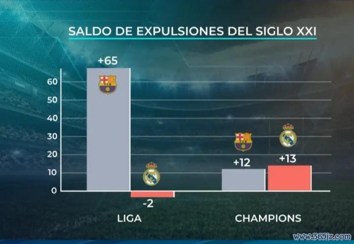直播吧09月14日讯 皇马电视台晒出一组数据,在西甲层面,参加21世纪以来,巴萨享有+65的红牌收益,而皇马则呈现-2的负收益。