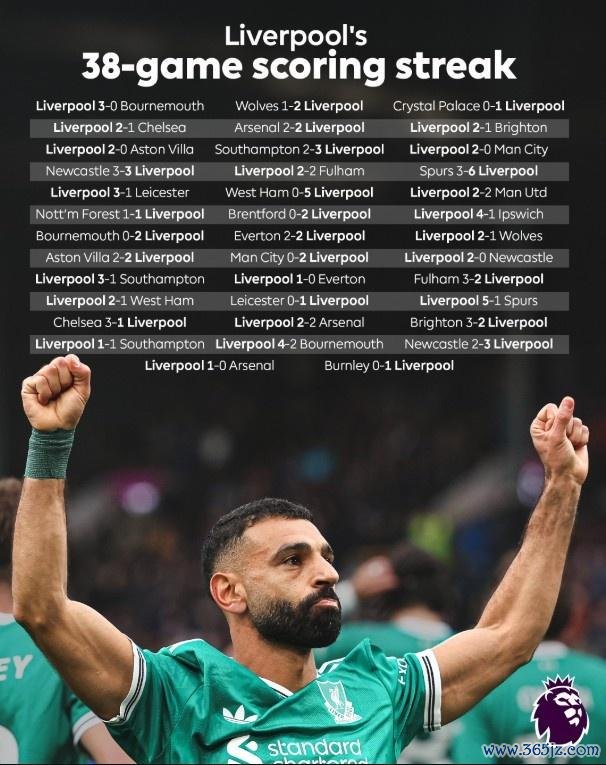 利物浦贯穿38场联赛得到进球,前次没进球是旧年9月14日0-1丛林