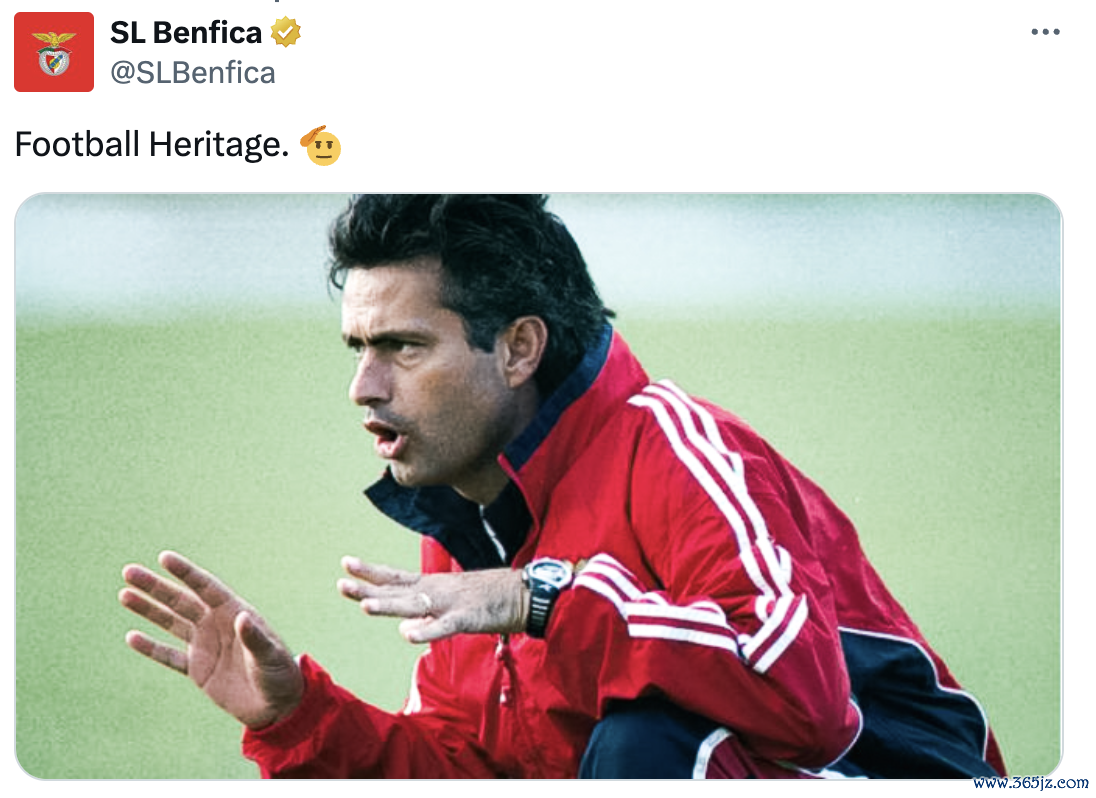 本菲卡社媒晒穆帅旧照,并配文:足球遗产