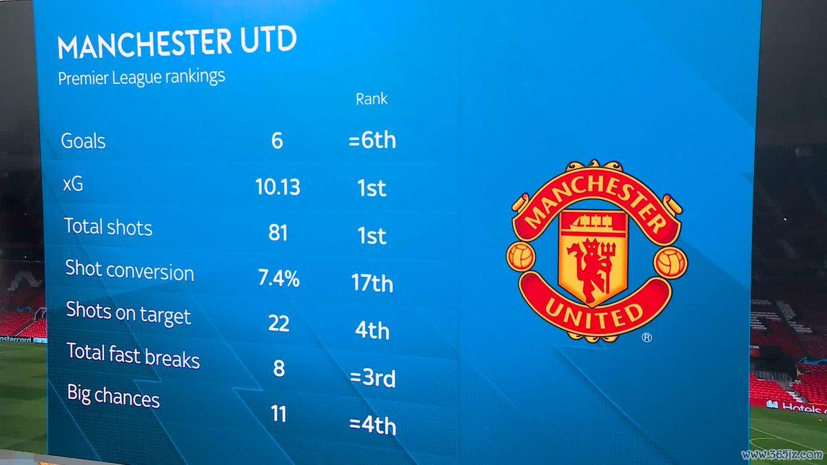 据统计,曼联在本赛季英超联赛的射门次数达到了81次,预期进球值则是10.13个,他们的这两项数据均位列第1。