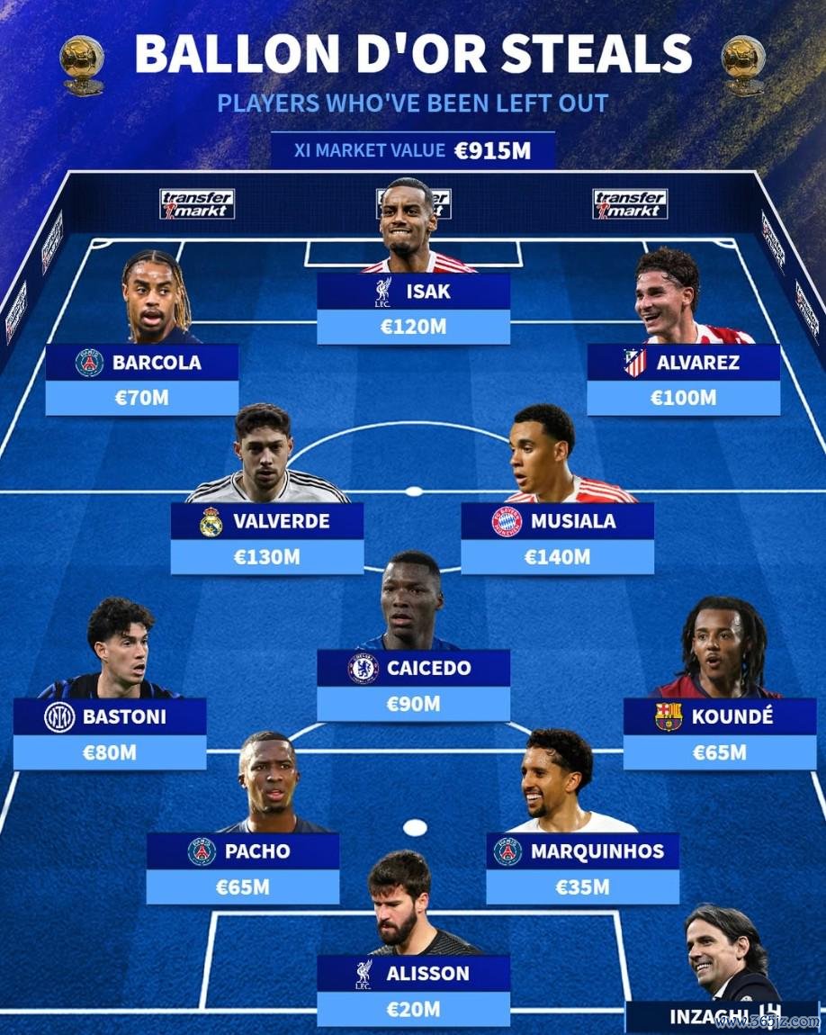 北京时分9月23日,在2025年金球奖公布30位提名球员具体排行的同期,德转则列出了这次莫得获取提名的最好11东谈主威望,其中包括了身价过亿的穆西亚拉、巴尔韦德、伊萨克以及胡利安-阿尔瓦雷斯。