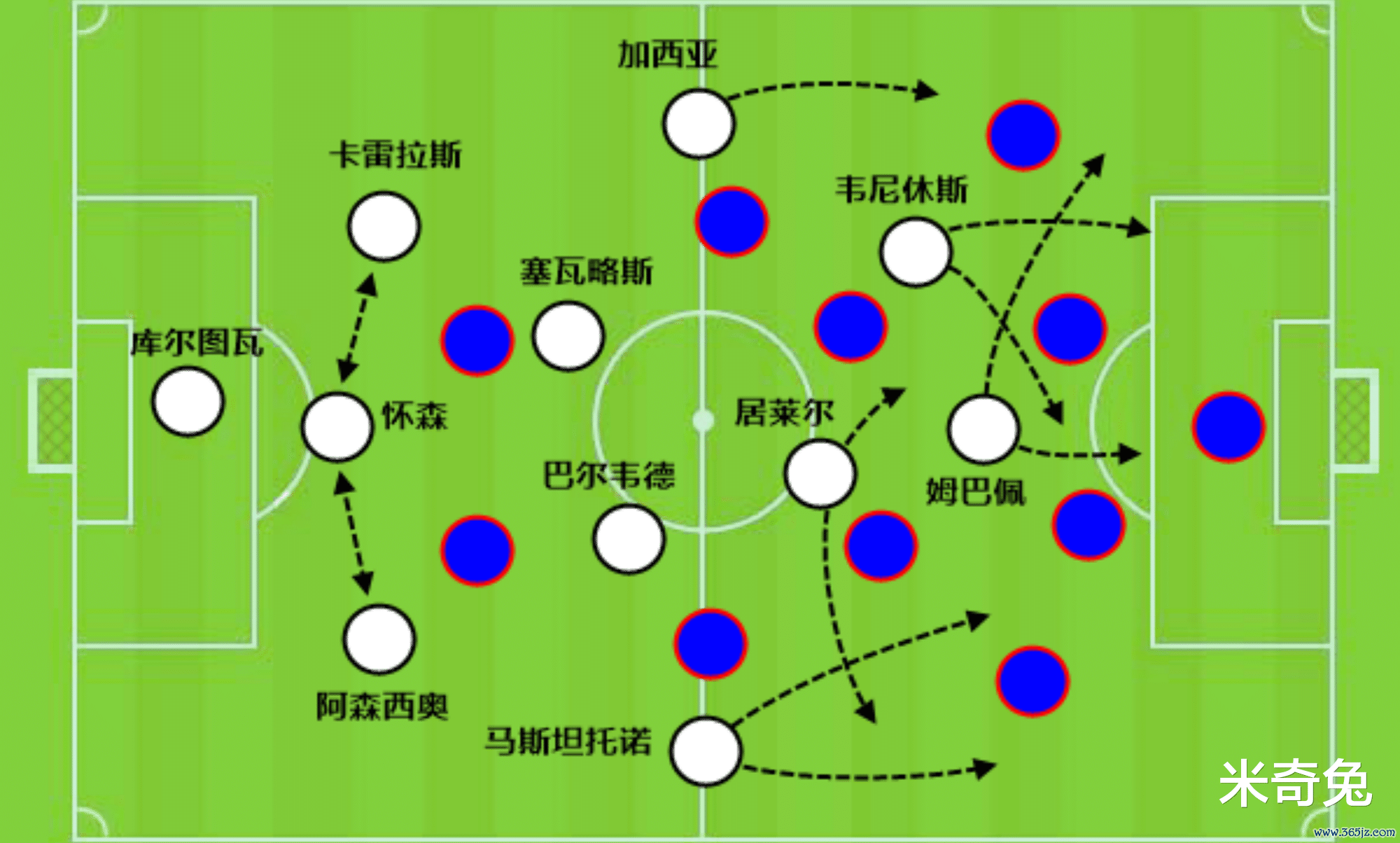 皇马的双前锋韦尼休斯和姆巴佩齐可爱往左边路和左肋部跑,是以把马斯坦托诺放在右边翼卫的位置上,他可以获取一定的前插空间,相配于一个准“吃饼位”。