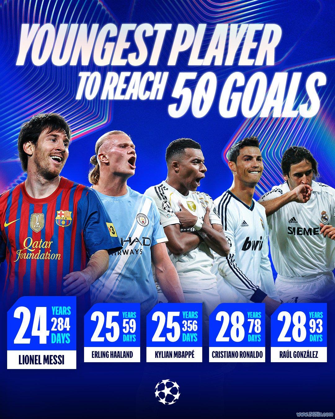 欧冠最年青50球名次:梅西居首,哈兰德姆巴佩分列二三