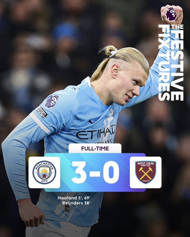 北京期间12月20日23:00,英超联赛第17轮,曼彻斯特城主场迎战西汉姆联。上半场哈兰德补射闪击到手+头球造险,铁锤帮0射门,哈兰德助攻赖因德斯抽射扩大比分,半场死心,曼城2-0西汉姆。下半场鲍文抽射造险,哈兰德抽射完成双响,最终曼城3-0西汉姆各赛事7连胜。