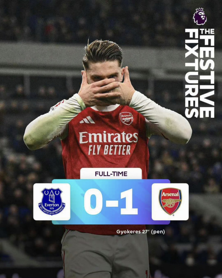 北京期间12月21日04:00,英超联赛第17轮,埃弗顿镇守主场迎战阿森纳。上半场,奥布莱恩手球送点,约克雷斯点射立功。易边再战,特罗萨德、苏维门迪中柱。最终阿森纳1-0埃弗顿。积分榜方面,阿森纳39分以2分上风领跑,埃弗顿24分第十。