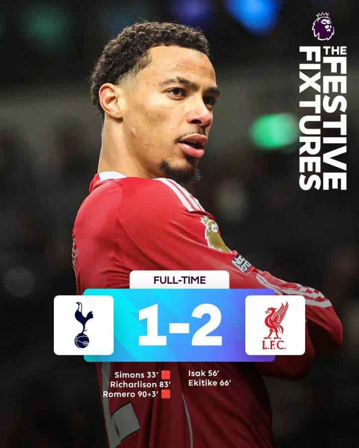 北京期间12月21日01:30,英超联赛第17轮,托特纳姆热刺镇守主场迎战利物浦。上半场哈维·西蒙斯蹬踏范戴克,被直红罚下,热刺暂0-0利物浦;下半场伊萨克接维尔茨助攻破门后伤退,埃基蒂克再下一城,里沙利松扳回一球,罗梅罗补时阶段两黄变一红被罚下,最终利物浦2-1九东说念主热刺,各项赛事三连胜。