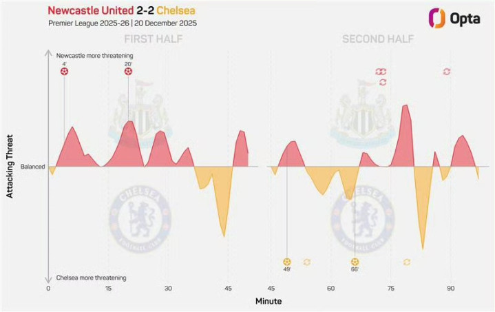 北京期间12月20日20:30,英超联赛第17轮,切尔西客场挑战纽卡斯尔。上半场韦斯利·福法纳荒唐,沃尔特马德破门,随后戈登助攻沃尔特马德再下一城,上半场切尔西暂0-2纽卡斯尔;下半场里斯·詹姆斯落拓球破门扳回一球,若昂·佩德罗单刀球扳平,最终切尔西2-2纽卡斯尔,近5轮仅1胜。
