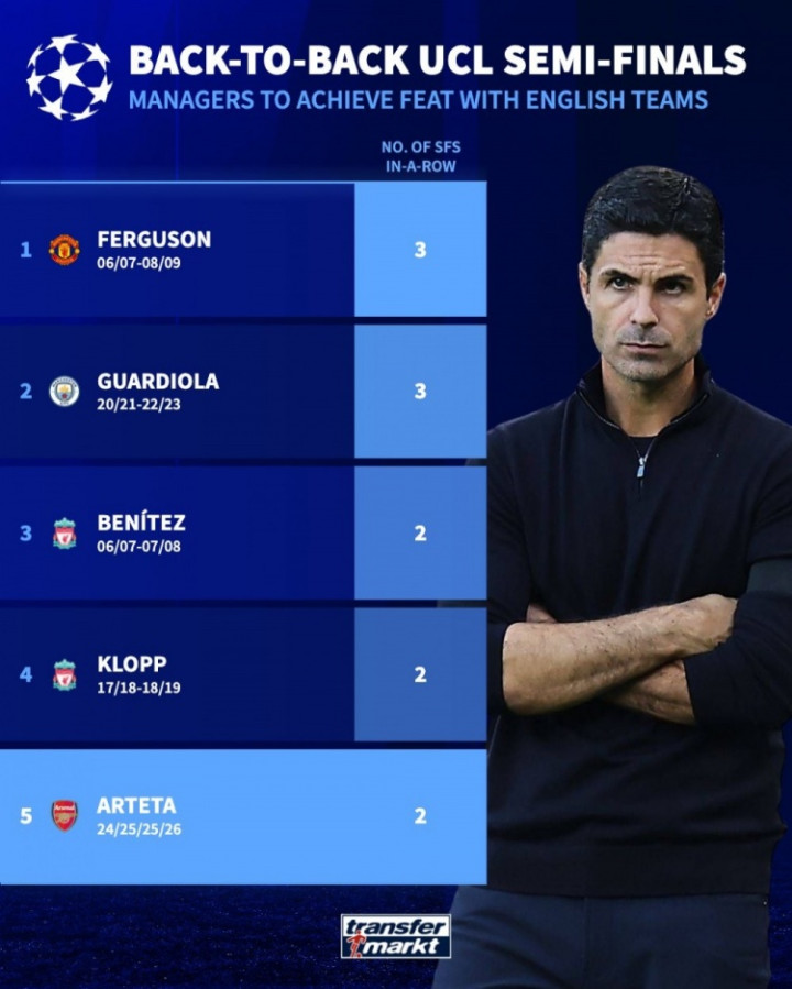 统计表明,阿尔特塔成为历史上第五位连续带队进入欧冠四强的英超主指导教练员,在他之前,只有弗格森(2006-07赛季至2008-09赛季连续3次)、瓜迪奥拉(2020-21赛季至2022-23赛季连续3次)、贝尼特斯(2006-07赛季至2007-08赛季连续2次)和克洛普(2017-18赛季至2018-19赛季连续2次)做到过。