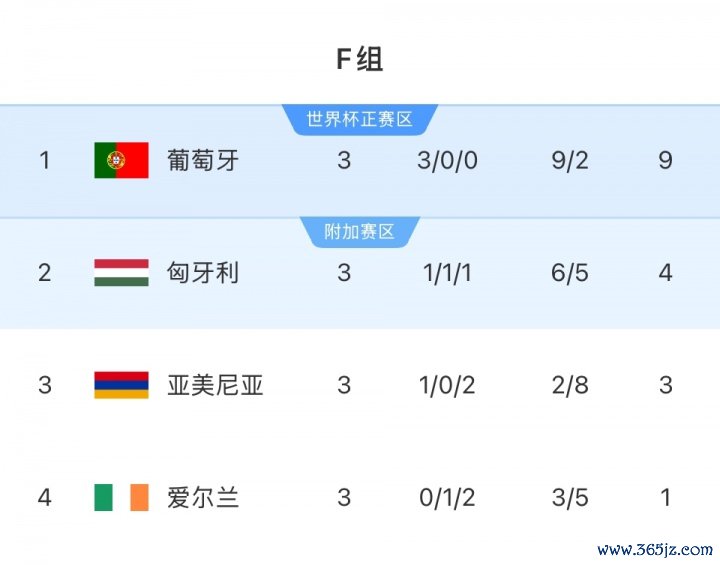 赛后,积分榜情况,葡萄牙3连胜积9分,名轮番一;匈牙利4分第二、亚好意思尼亚3分第三、爱尔兰独一1分名次垫底。