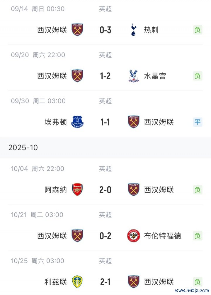 西汉姆1胜1平7负,先赛暂排倒数第二,联赛已三连败、六场不堪。