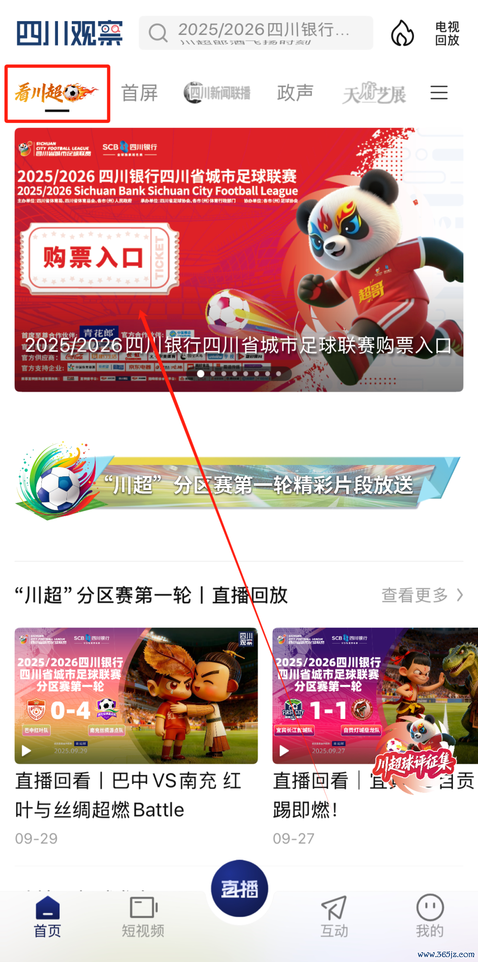 在四川不雅察APP首页左上角找到“看川超”按钮,即可点击干涉“购票进口”。