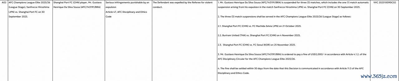 遭禁赛3场的古斯塔沃将缺席上港主场对阵町田泽维亚、客场挑战武里南联以及主场迎战首尔FC的比赛,此外他还被罚金2000好意思金。